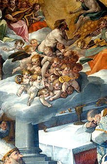 Simone de Magistris was appointed to decorate these new public buildings. The Cardinal in fact appreciated his pictorial language and his ability of interpreting the needs of the holy art as expressed in the Trento Council (that was called by Paul III in 1545 and ended in 1563)
