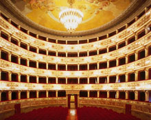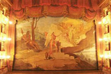 The existing building, inaugurated in 1790, was conceived by Cosimo Morelli to substitute the preceding wooden theatre, which was devastated ten years earlier by a fire (they conserved the designs of the layout and the boxes). The architect, who had already created the theatres of Osimo and Macerata, designed a neoclassical theatre with an oval layout, five rows of boxes and the ‘three mouthed’ stage, which had already been modified in 1797 by painter Giuseppe Lucatelli and was then substituted with a more canonical and unique proscenium. In 1830, the renovation of the theatre was completed by the architect Pietro Ghinelli, who had previously devised the Muse Theatre in Ancona and gave the Aquila Theatre its present structure: 124 boxes with a capacity of a thousand and a stage with a unique opening measuring 350m2, as well as five rows of boxes from the layout of the original project. The vault of the theatre symbolising the Gods of Olympus, the Graces, the six nocturnal dancers intent on listening to Apollo and the curtain depicting Harmonia delivering the zither to the spirit of Fermo, were all created by Luigi Cochetti, whilst Alessandro Sanquirico of Verona, the greatest set designer of the era, prepared the backdrops for the theatre, four of which are still kept in the building’s warehouse. The exquisite gilded iron chandelier with 56 arms, decorated with wooden and crystal leaves, was ordered in Paris in 1830 and still shines today from the centre of the auditorium, famous for its perfect acoustics.