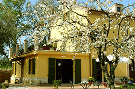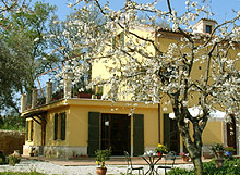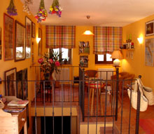 An old farmhouse built at the beginning of the 20th century, Il Melograno Bed and Breakfast is just outside Massignano. The ochre yellow colour of the outside is mirrored in the different shades of yellow inside creating a warm welcoming atmosphere. In the garden birds have their own little wooden house hanging from the branch of a cherry tree and a bird bath under the big fig trees. The birds seem to appreciate these “personal facilities” and have scattered seeds of several plants including some majestic sunflowers all over the garden