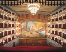 The existing building, inaugurated in 1790, was conceived by Cosimo Morelli to substitute the preceding wooden theatre, which was devastated ten years earlier by a fire (they conserved the designs of the layout and the boxes). The architect, who had already created the theatres of Osimo and Macerata, designed a neoclassical theatre with an oval layout, five rows of boxes and the ‘three mouthed’ stage, which had already been modified in 1797 by painter Giuseppe Lucatelli and was then substituted with a more canonical and unique proscenium. In 1830, the renovation of the theatre was completed by the architect Pietro Ghinelli, who had previously devised the Muse Theatre in Ancona and gave the Aquila Theatre its present structure: 124 boxes with a capacity of a thousand and a stage with a unique opening measuring 350m2, as well as five rows of boxes from the layout of the original project. The vault of the theatre symbolising the Gods of Olympus, the Graces, the six nocturnal dancers intent on listening to Apollo and the curtain depicting Harmonia delivering the zither to the spirit of Fermo, were all created by Luigi Cochetti, whilst Alessandro Sanquirico of Verona, the greatest set designer of the era, prepared the backdrops for the theatre, four of which are still kept in the building’s warehouse. The exquisite gilded iron chandelier with 56 arms, decorated with wooden and crystal leaves, was ordered in Paris in 1830 and still shines today from the centre of the auditorium, famous for its perfect acoustics.