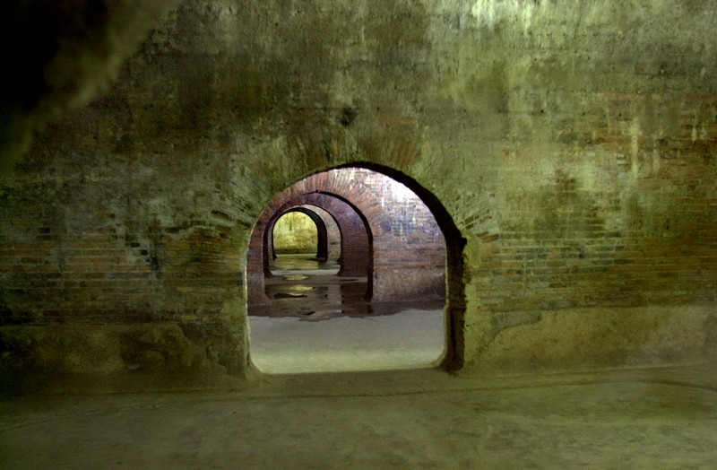 It is comprised of thirty adjoining chambers, set out in three rows with ten chambers in each. Each one of them is at a level that is slightly lower in respect to the next, in such a way that the water could slowly flow away from one chamber to another in order to reach the only exit point, which would introduce the water resource to the aqueduct and resupply the city. If up to now, this already seems like an astonishing piece of work, think about what it would have been to the Romans. The cisterns were waterproofed with opus signinum, which is a mixture of broken up terracotta and a very resistant mortar. The water level was kept quite low, at about 70cm, so that it did not compromise the stability of the structure. The flow of the water was calculated in such a way that it moved quickly enough to prevent the water from putrefying, but slowly enough to allow the sedimentation of any impurities at the bottom of the basin. It was also perfectly ventilated, thanks to the 13 ventilation shafts that were periodically opened to introduce fresh air into the cistern. The result of all this was that there was crystalline and drinkable water, which would be introduced into the city’s aqueduct.